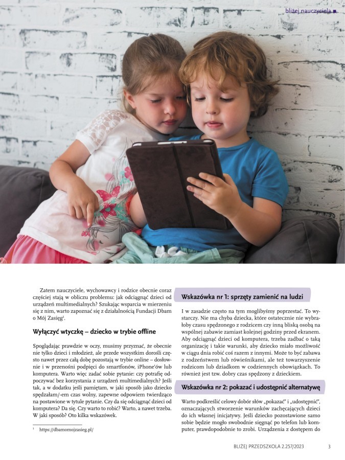 W ramach obchodów „ Dnia bezpiecznego Internetu”, zachęcamy Państwa do zapoznania się z artykułem: „Cyfrowa pandemia – czy da się odciągnąć dzieci od urządzeń multimedialnych?” to rzetelne i praktyczne spojrzenie na problem, który dotyczy niemal każdej rodziny. Autorka pokazuje, jakie konsekwencje może mieć nadmierne korzystanie z urządzeń cyfrowych, ale przede wszystkim podpowiada konkretne rozwiązania – jak budować dobre nawyki, stawiać jasne granice i wzmacniać relacje w świecie offline.