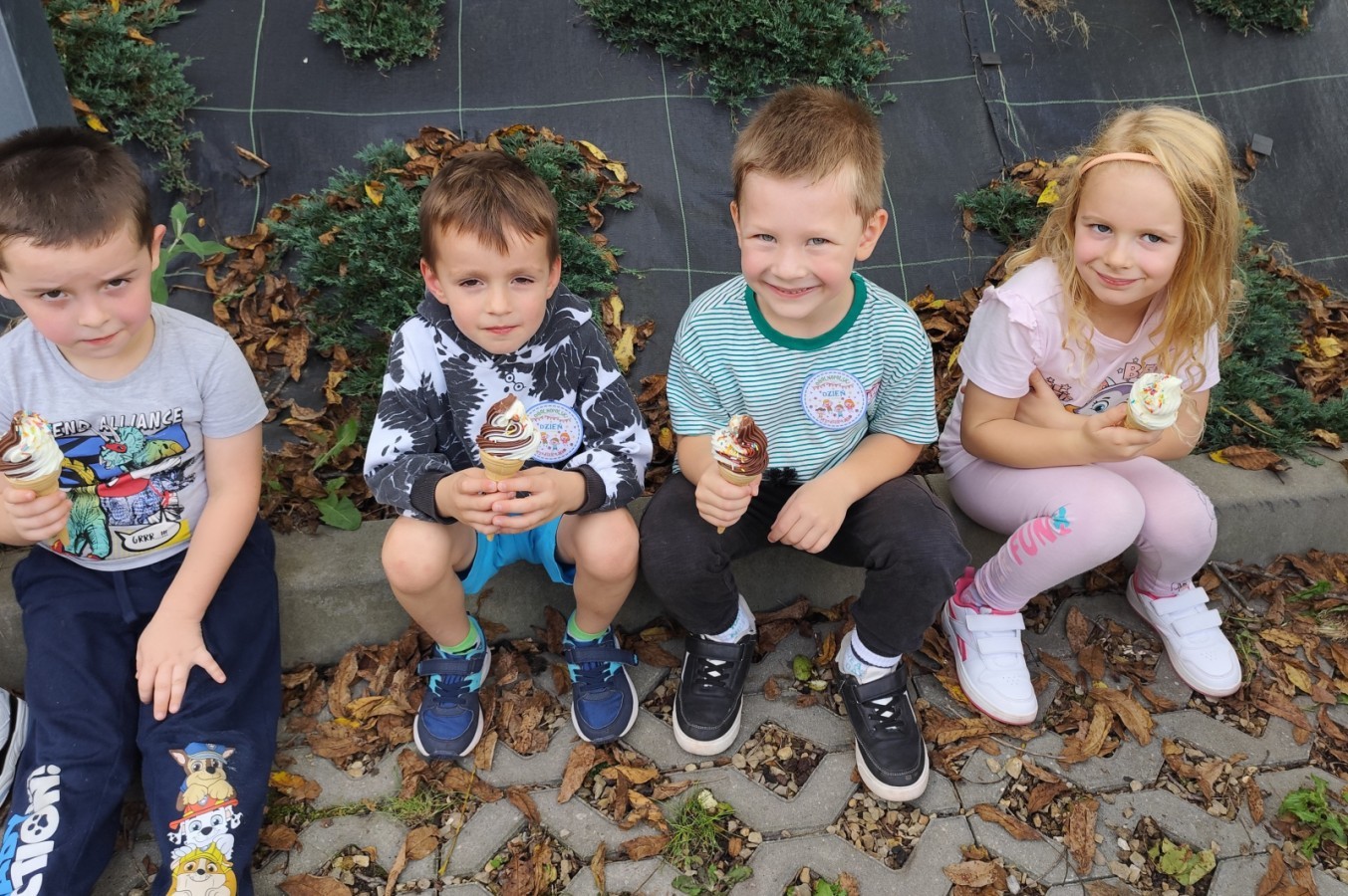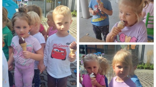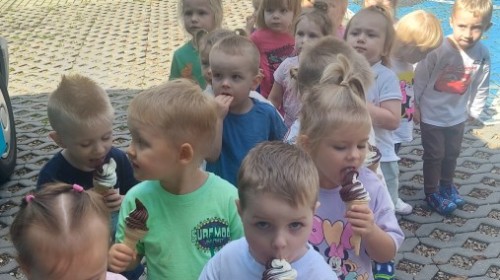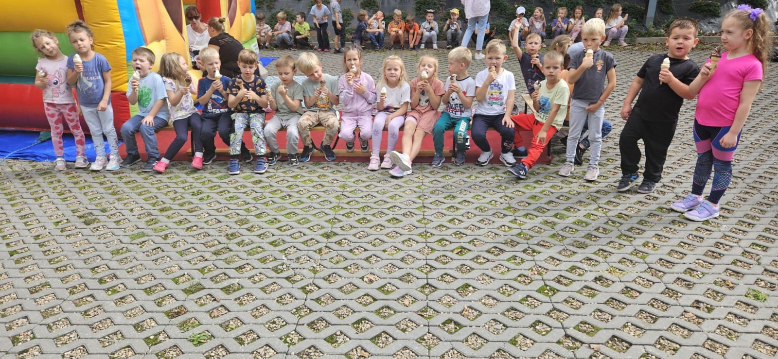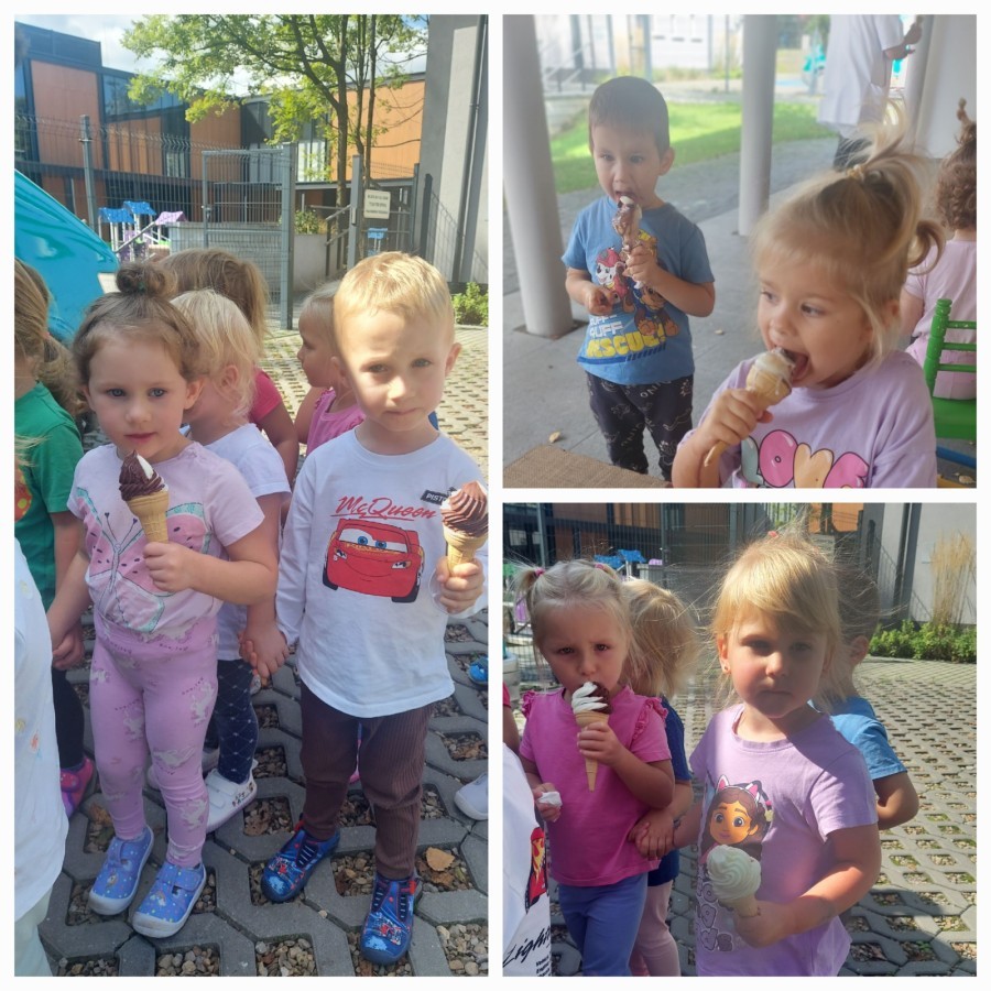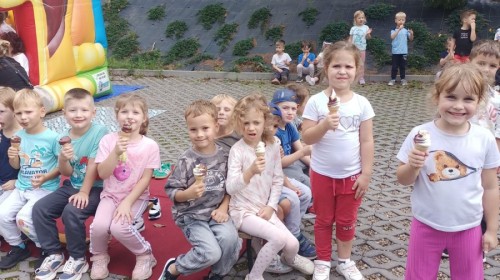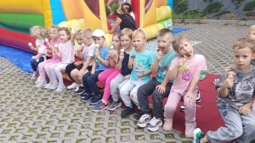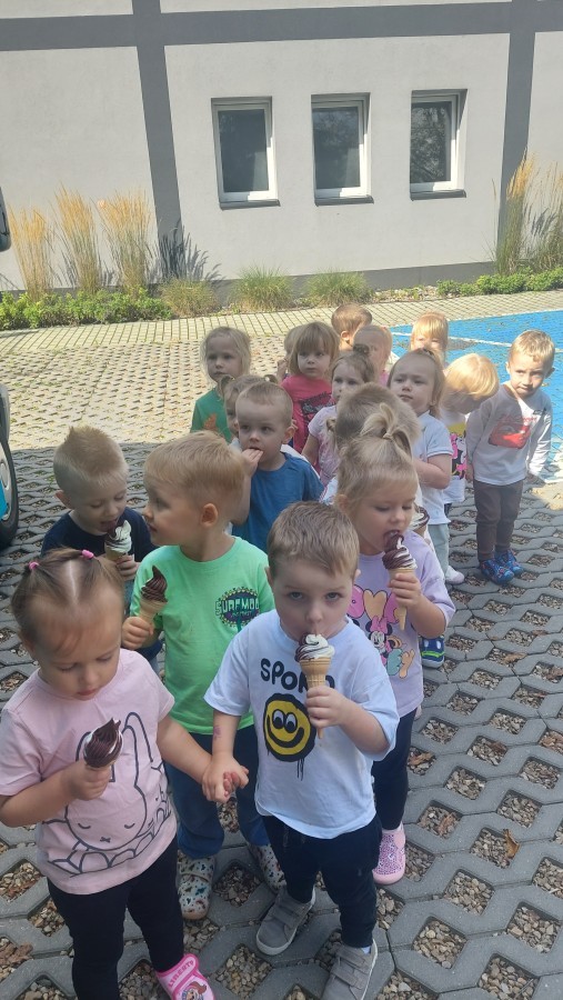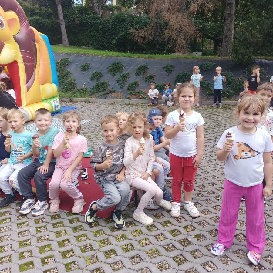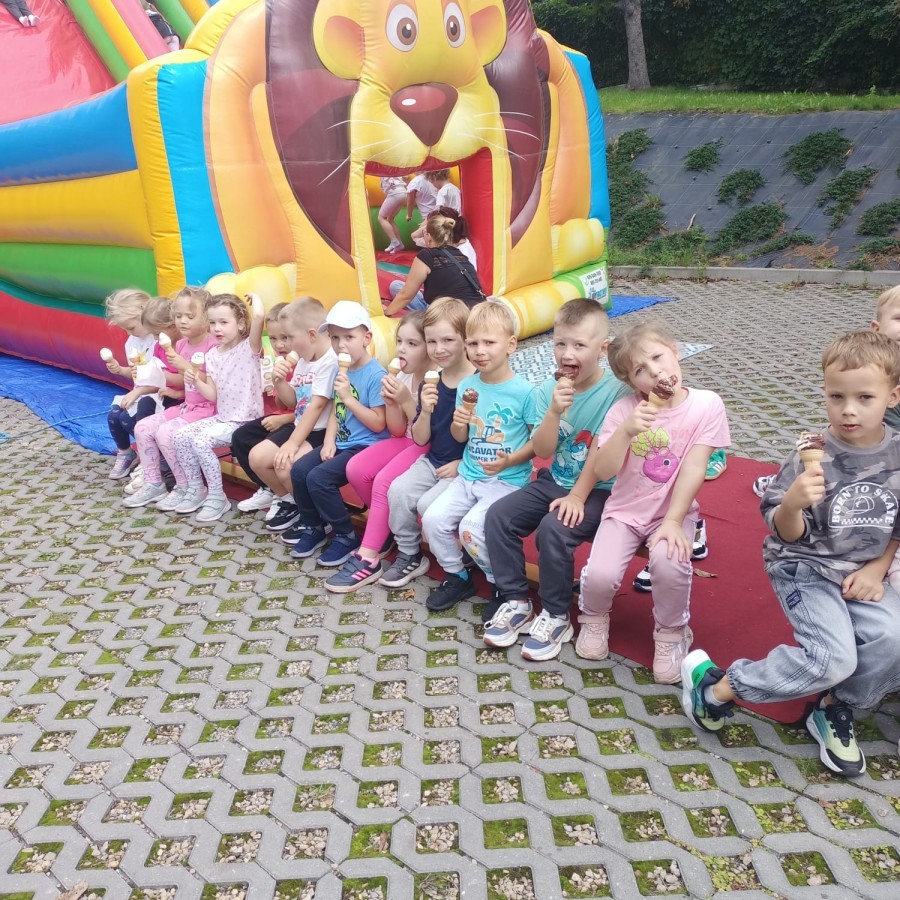 Dzisiejszy dzień dostarczył naszym przedszkolakom mnóstwo radości i niezapomnianych wrażeń. Rozpoczęliśmy od wspólnych zabaw ruchowych i muzycznych, które wprowadziły wszystkich w doskonały nastrój. Następnie przyszedł czas na aktywność na świeżym powietrzu - dzieci z entuzjazmem korzystały z dmuchanej zjeżdżalni i placu zabaw. Na zakończenie czekała na wszystkich słodka niespodzianka - pyszne lody, które były idealnym zwieńczeniem tego pełnego atrakcji dnia.