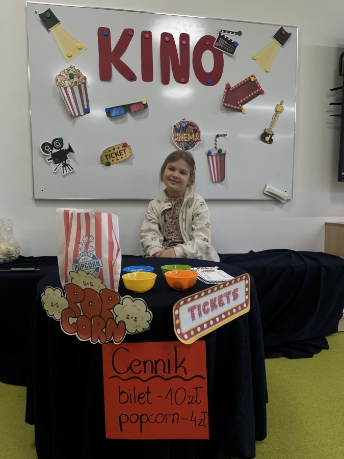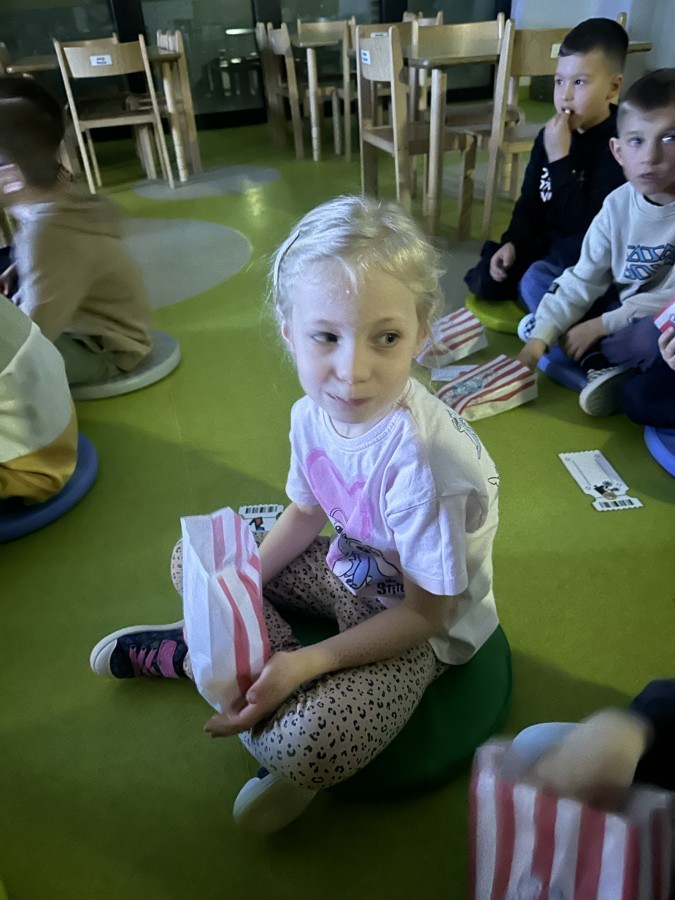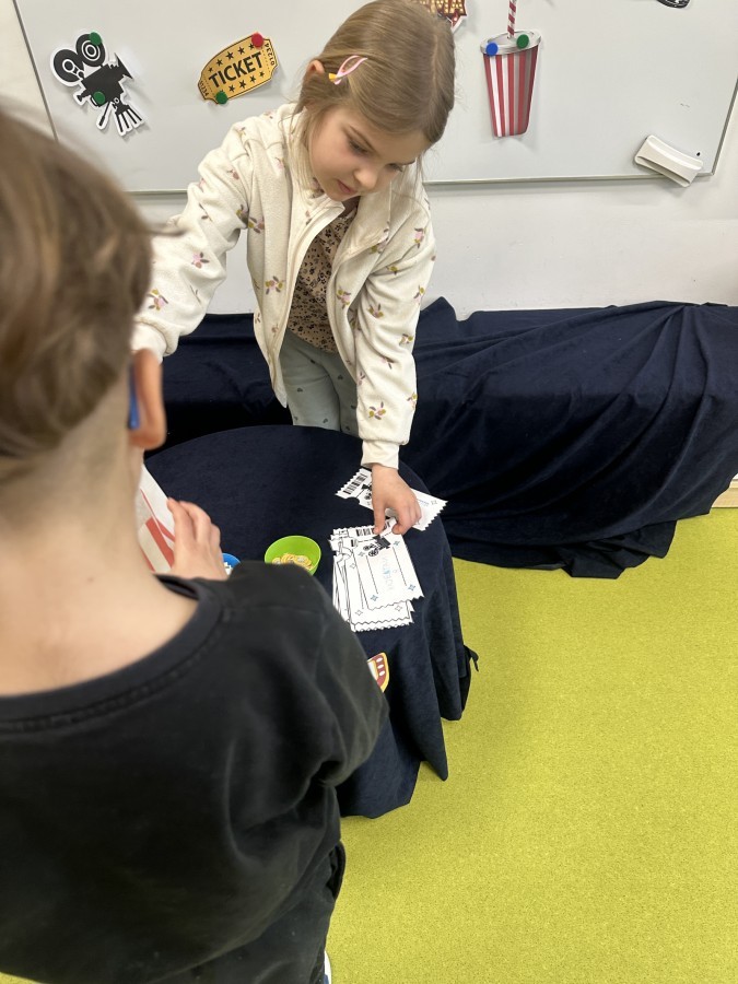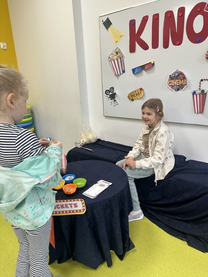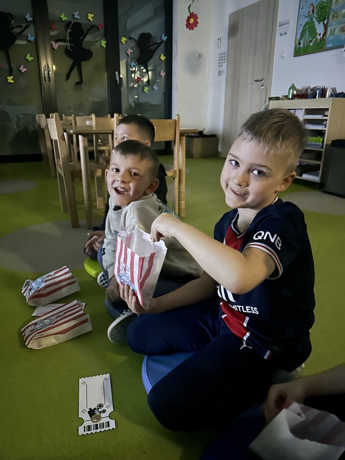 W ostatnim dniu dzieci stworzyły w naszej sali prawdziwe kino. Najpierw musiały kupić bilety oraz popcorn w kasie, przeliczały pieniądze i sprawdzały, czy wystarczy im na zakupy. Następnie zajęły miejsca na widowni i obejrzały bajkę jak w prawdziwym kinie.