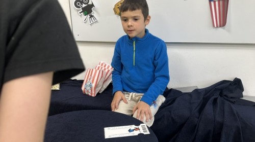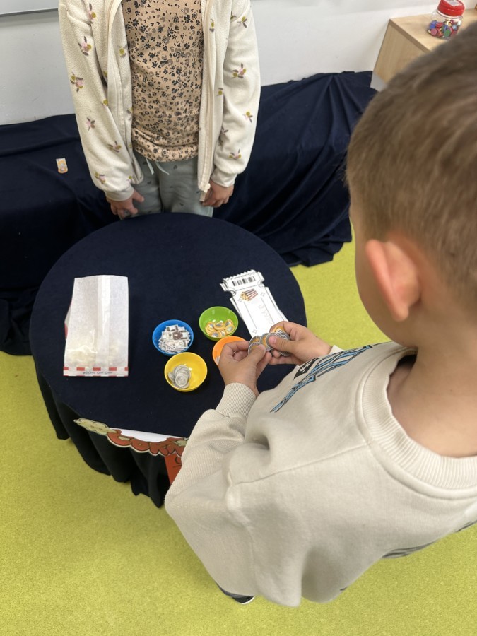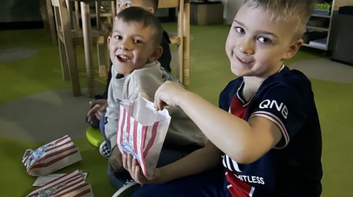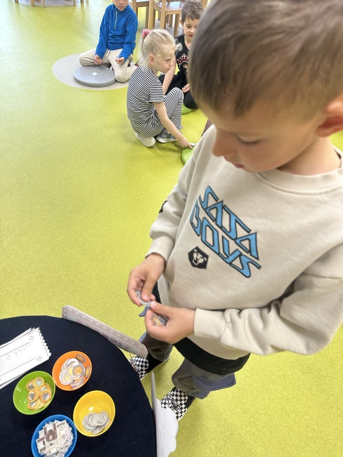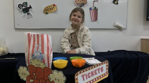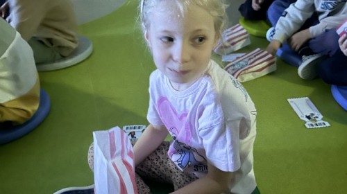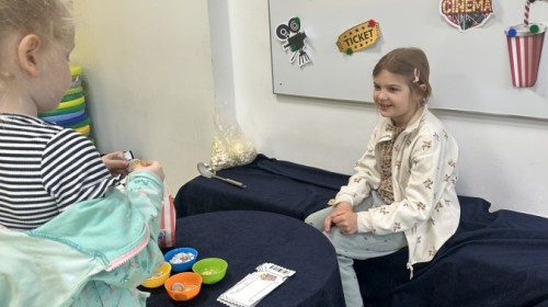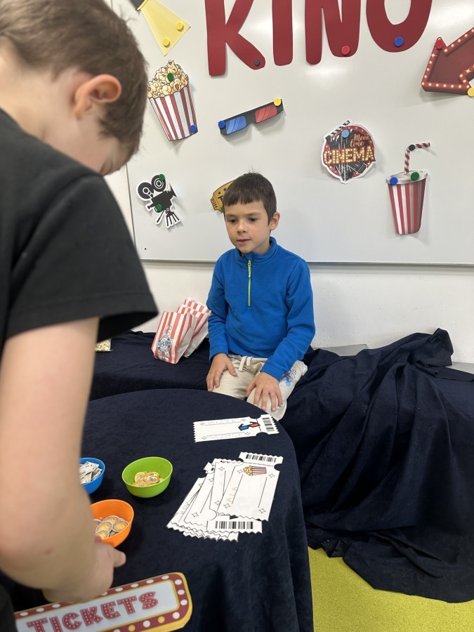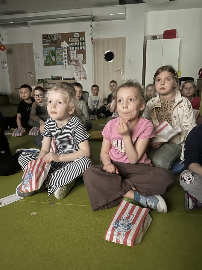 W ostatnim dniu dzieci stworzyły w naszej sali prawdziwe kino. Najpierw musiały kupić bilety oraz popcorn w kasie, przeliczały pieniądze i sprawdzały, czy wystarczy im na zakupy. Następnie zajęły miejsca na widowni i obejrzały bajkę jak w prawdziwym kinie.