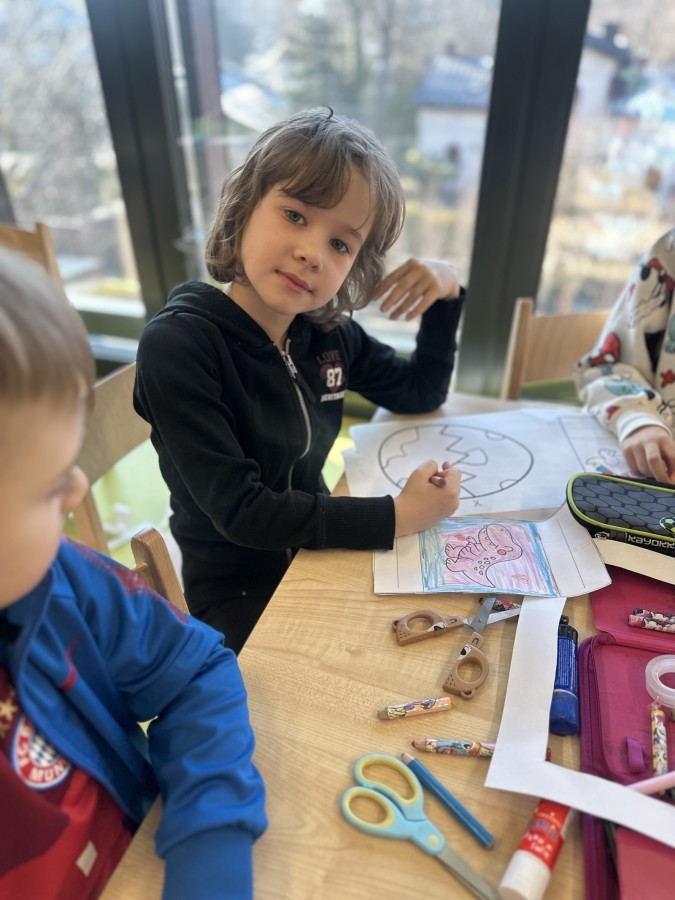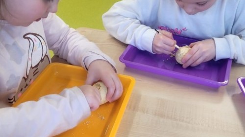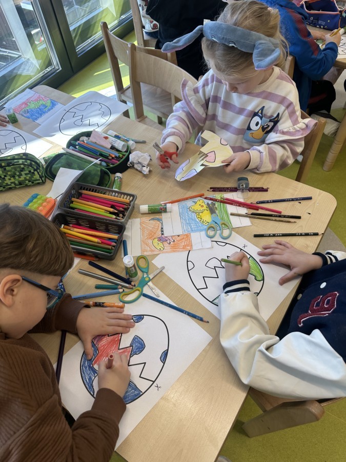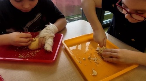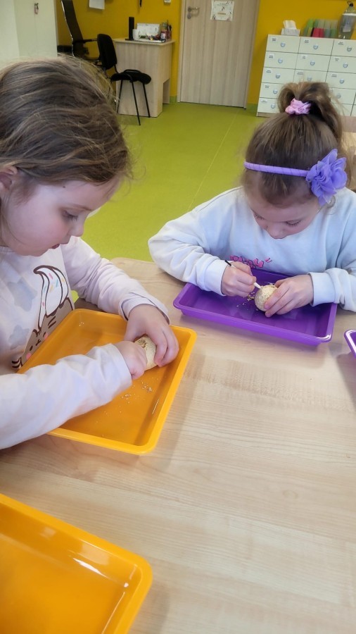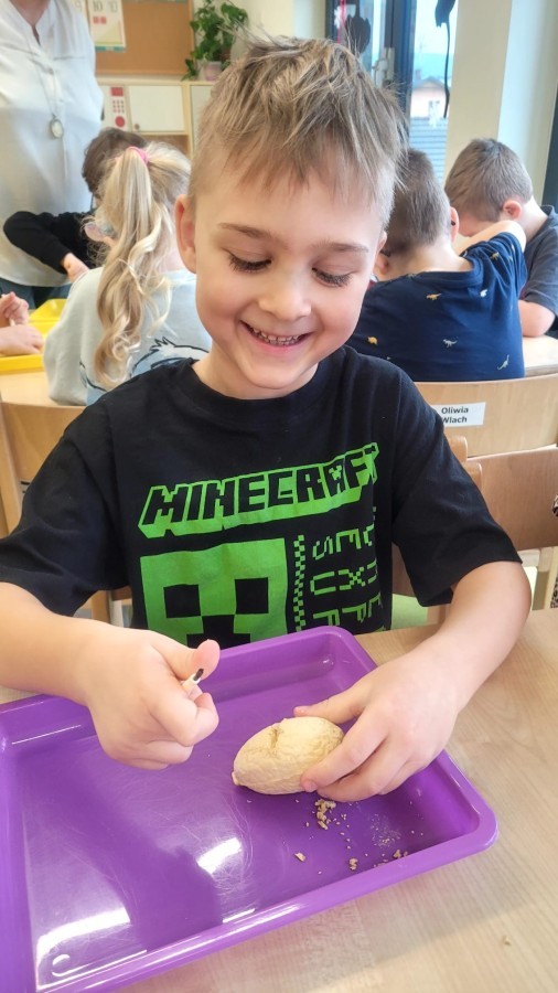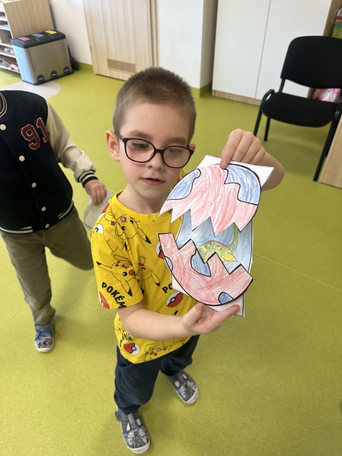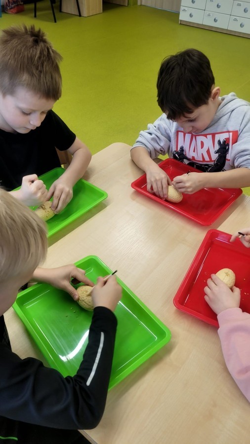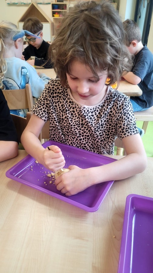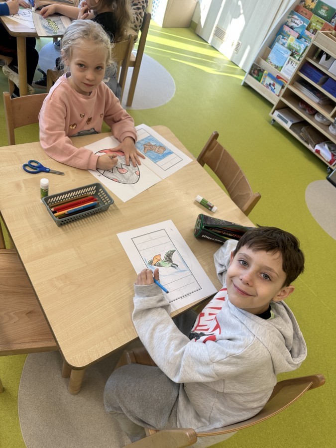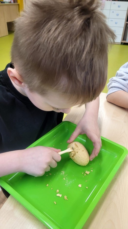 Nie zabrakło kreatywnych aktywności – dzieci wykonywały prace plastyczne, brały udział w zabawach ruchowych oraz małych „wykopaliskach archeologicznych”.