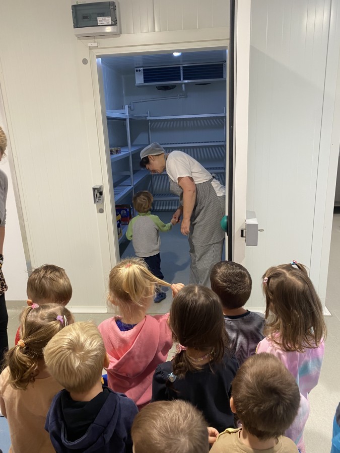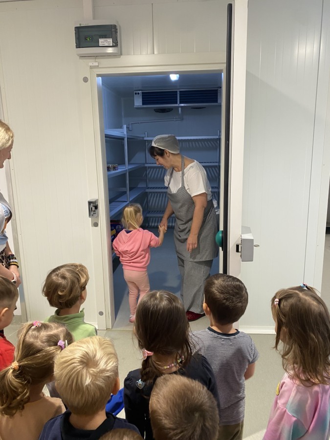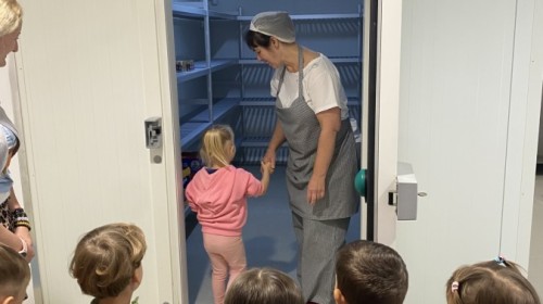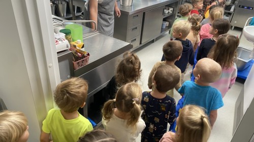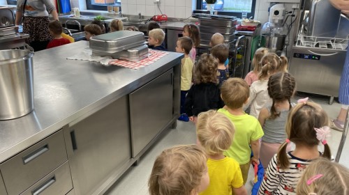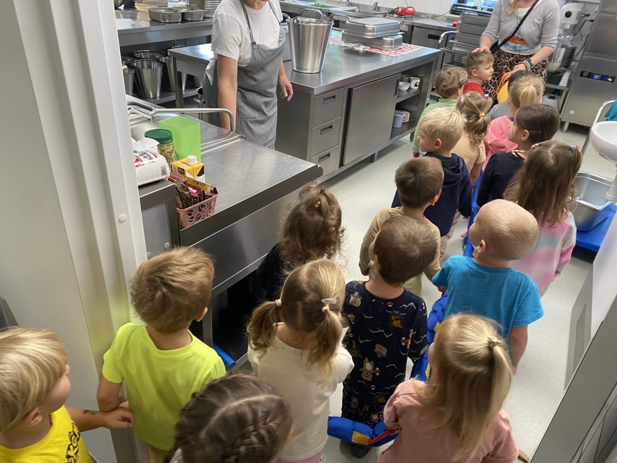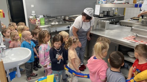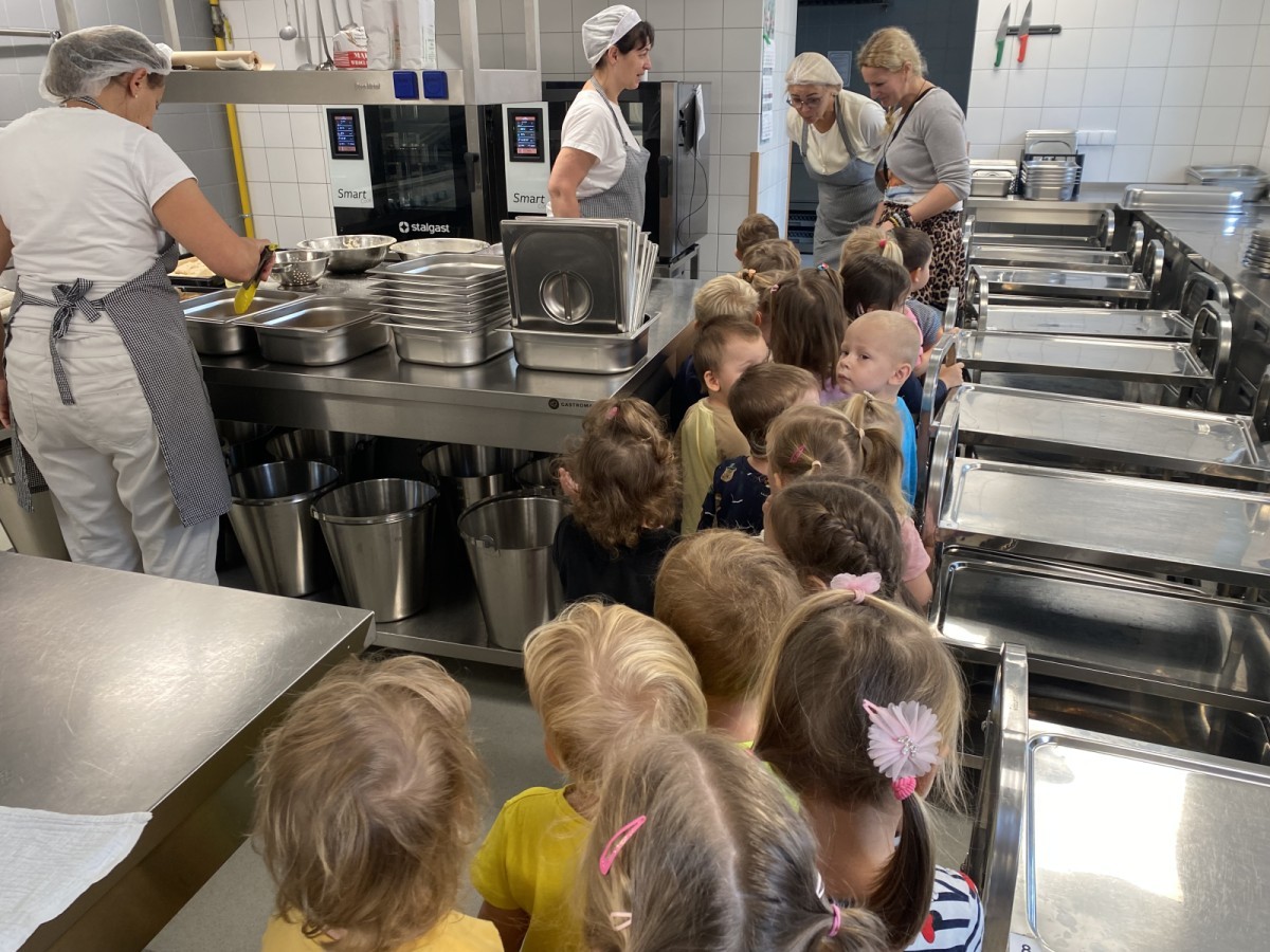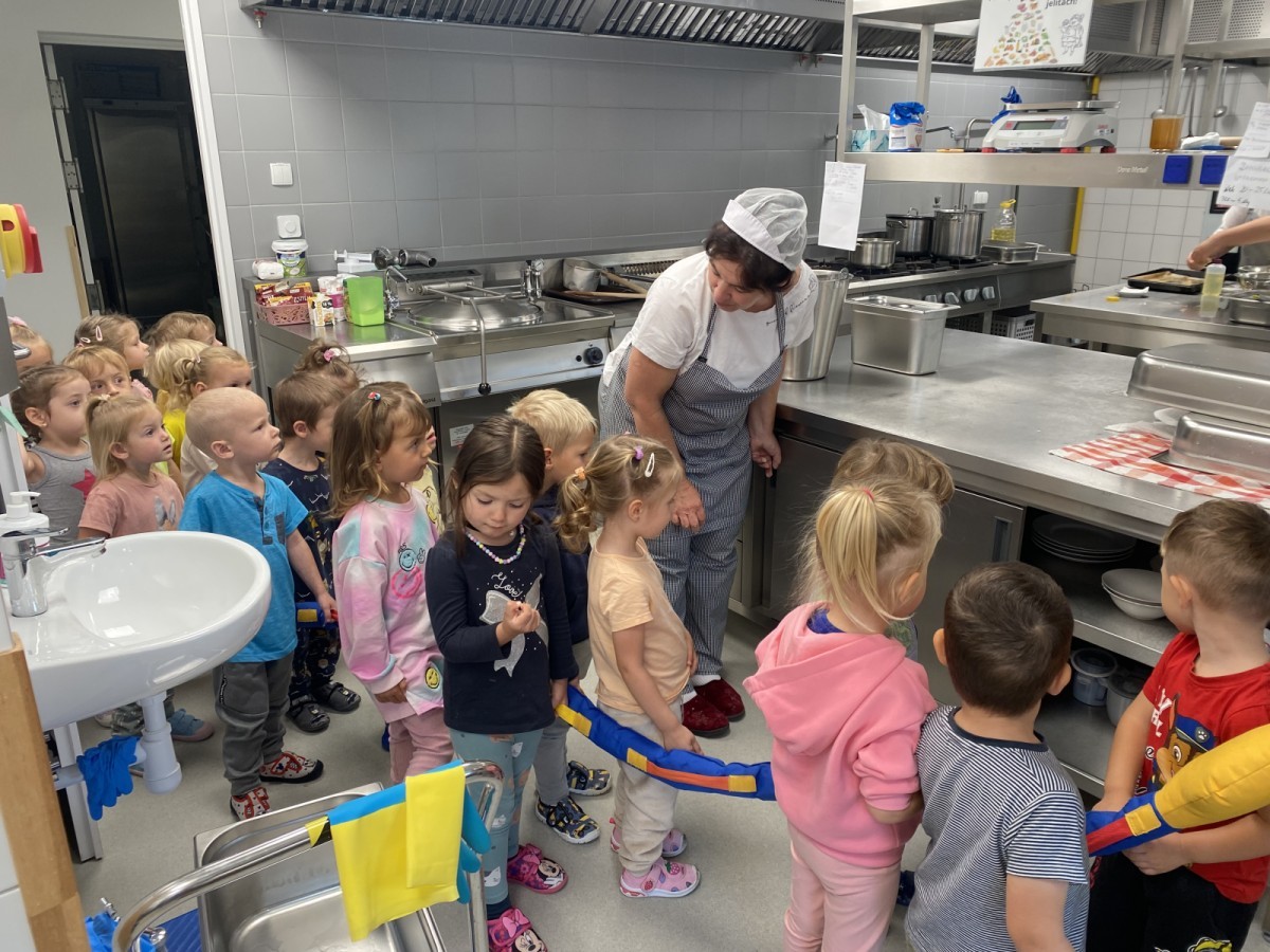 Krasnale coraz lepiej odnajdują się w przedszkolu – dobrze już znają swoją salę, zasady i codzienne rytuały. Tym razem wybrały się na spacer po przedszkolu, by lepiej poznać jego zakamarki. Największą atrakcją okazała się wizyta w kuchni, gdzie dzieci mogły zobaczyć, jak i gdzie przygotowywane są ich ulubione, pyszne obiady. Z ogromnym zaciekawieniem obserwowały kuchenne sprzęty, zapachy i porządek, który panuje w tym ważnym miejscu. Panie kucharki, które z uśmiechem i zaangażowaniem gotują dla wszystkich przedszkolaków, zrobiły na dzieciach duże wrażenie. Krasnale były szczęśliwe, że mogły je osobiście poznać!