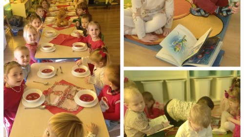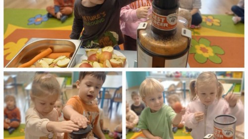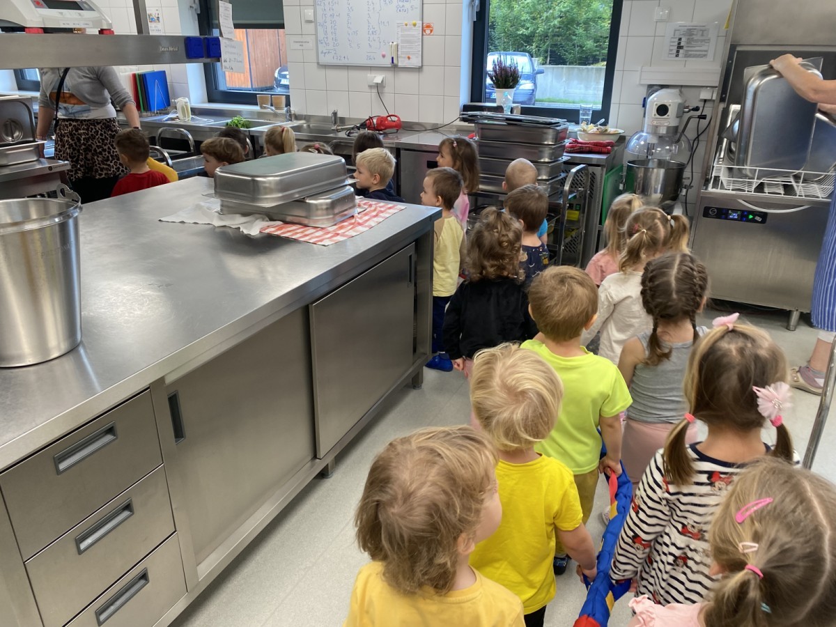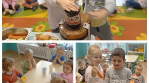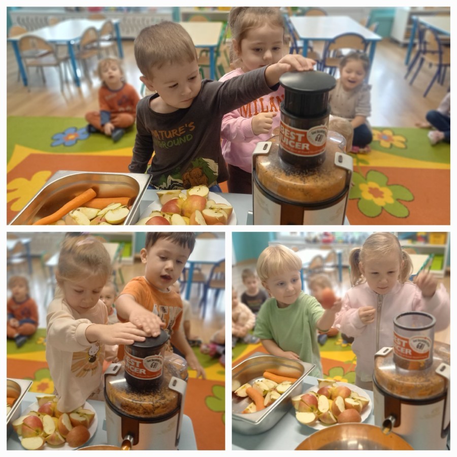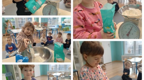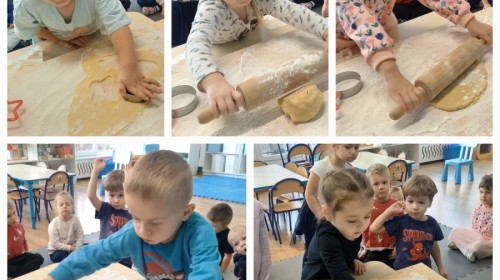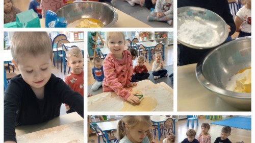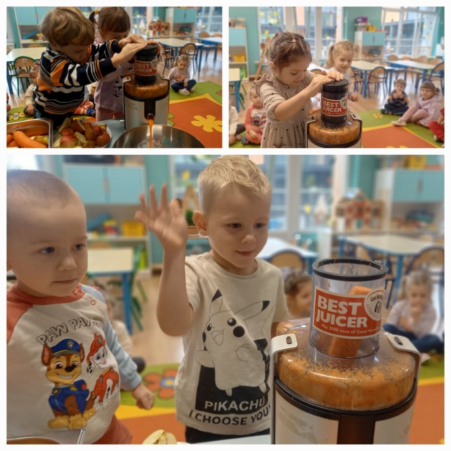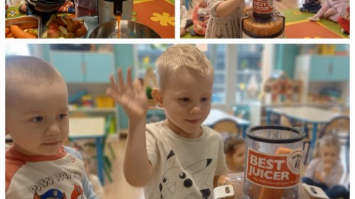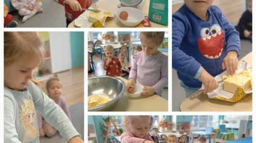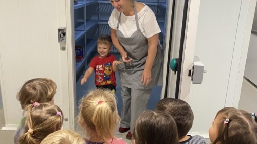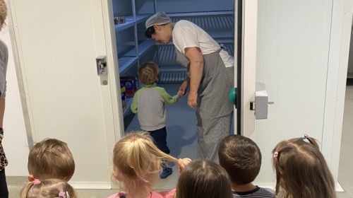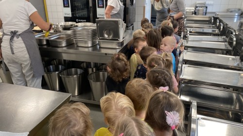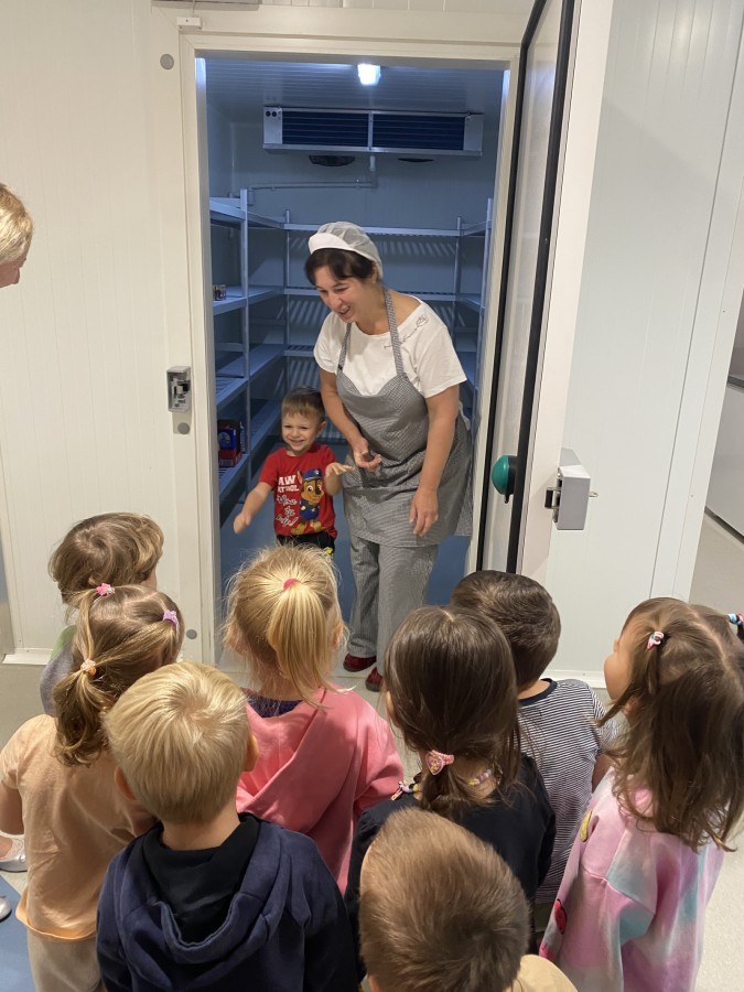 Krasnale coraz lepiej odnajdują się w przedszkolu – dobrze już znają swoją salę, zasady i codzienne rytuały. Tym razem wybrały się na spacer po przedszkolu, by lepiej poznać jego zakamarki. Największą atrakcją okazała się wizyta w kuchni, gdzie dzieci mogły zobaczyć, jak i gdzie przygotowywane są ich ulubione, pyszne obiady. Z ogromnym zaciekawieniem obserwowały kuchenne sprzęty, zapachy i porządek, który panuje w tym ważnym miejscu. Panie kucharki, które z uśmiechem i zaangażowaniem gotują dla wszystkich przedszkolaków, zrobiły na dzieciach duże wrażenie. Krasnale były szczęśliwe, że mogły je osobiście poznać!
