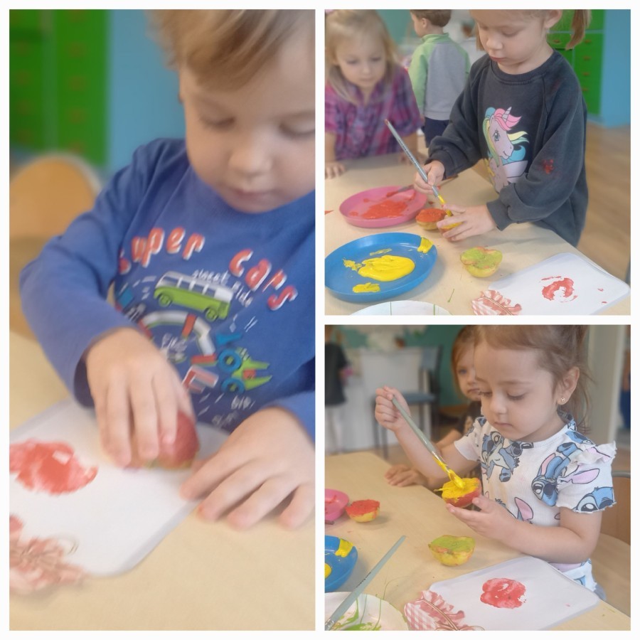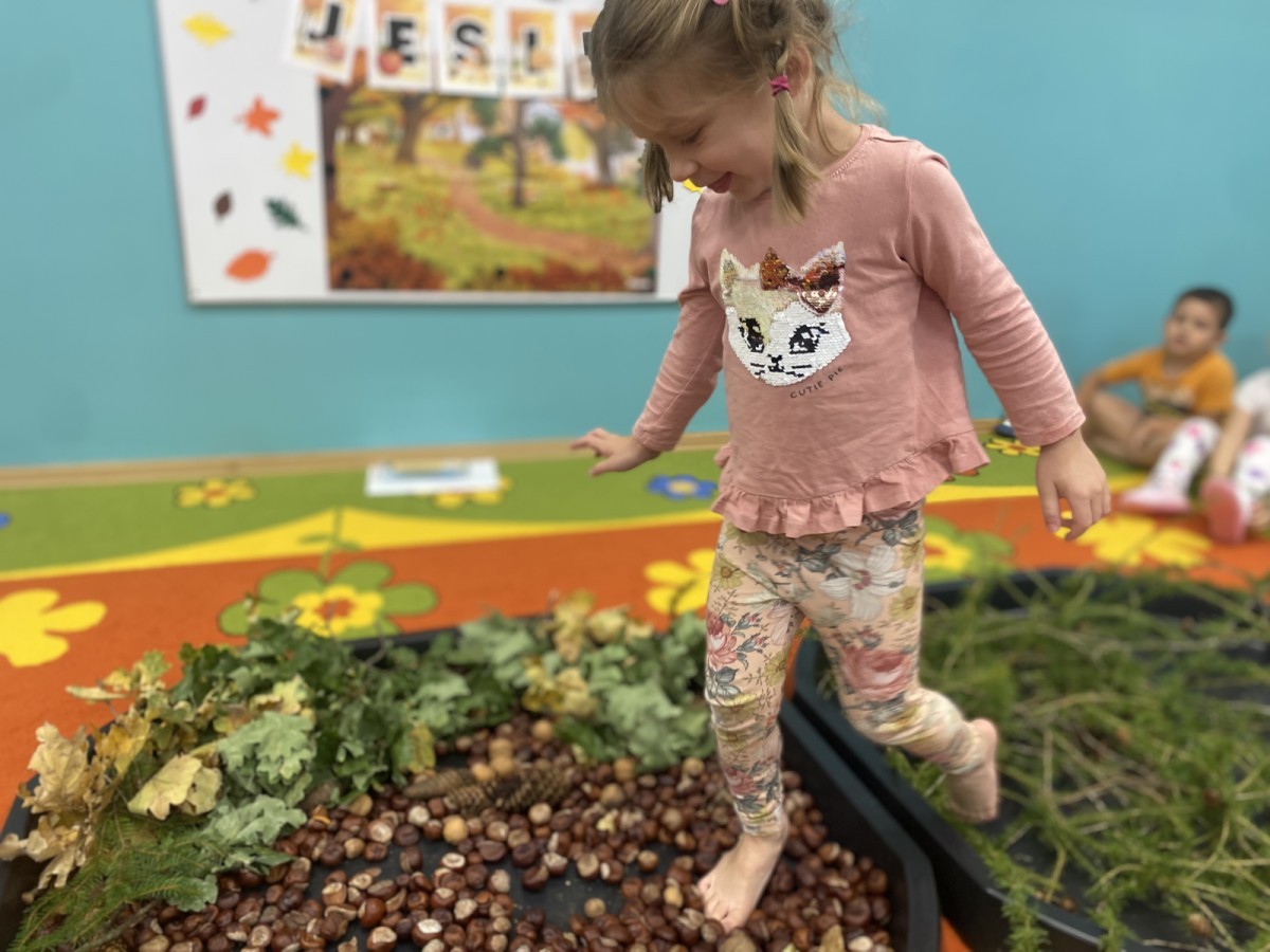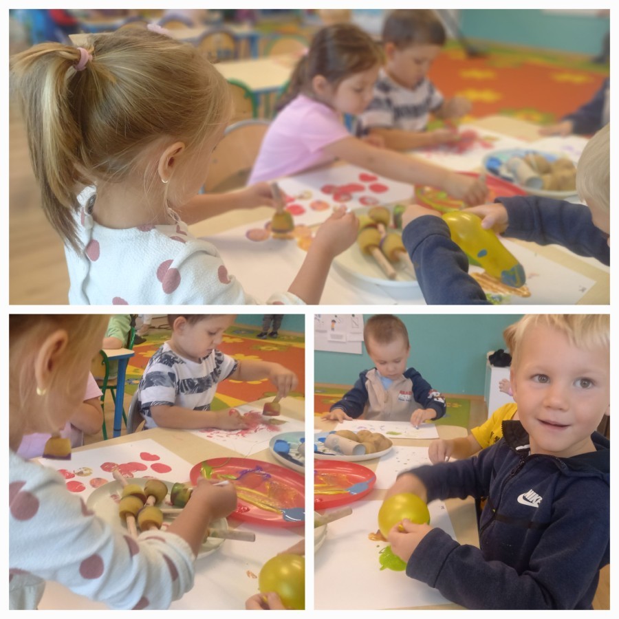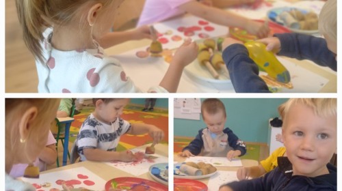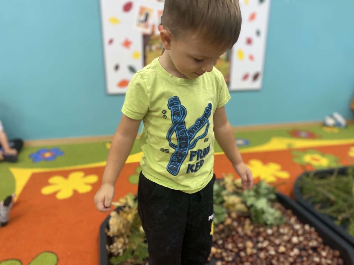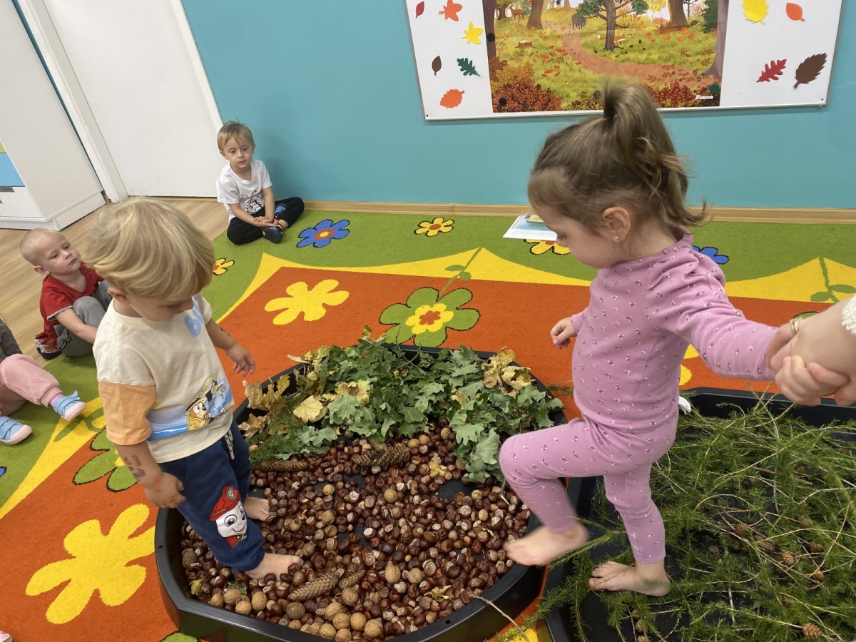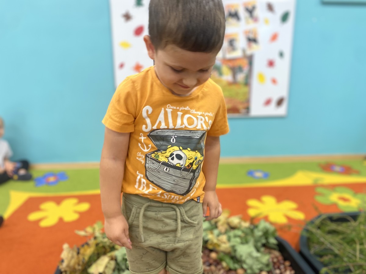 W grupie Krasnali nastała prawdziwa, złota jesień! Już od rana dzieci z radością przywitały wyjątkowego gościa – Panią Jesień, która przyniosła ze sobą kolorowe liście, kasztany i mnóstwo dobrej energii. Krasnale miały okazję przejść się po niezwykłym „dywanie Pani Jesieni” – sensorycznej ścieżce wypełnionej naturalnymi skarbami tej pory roku. To była prawdziwa uczta dla zmysłów! Nie zabrakło też chwili wytchnienia – dzieci z zaciekawieniem wysłuchały bajki o przybyciu Jesieni, a później rozruszały się podczas wesołych zabaw przy jesiennej muzyce. Na zakończenie tego wyjątkowego dnia mali artyści stworzyli piękne, kolorowe prace plastyczne malując... kasztanami!