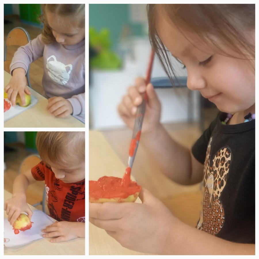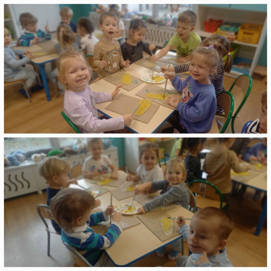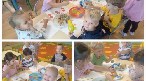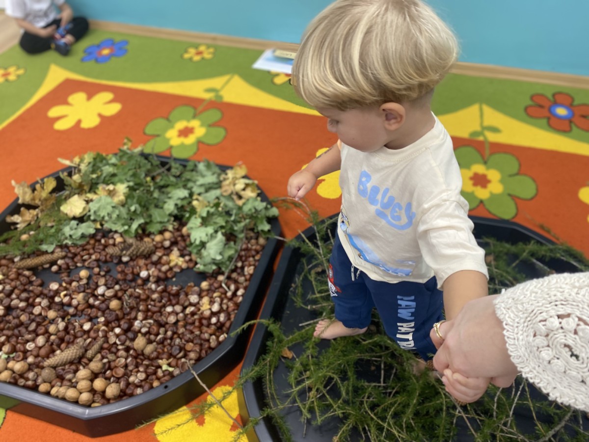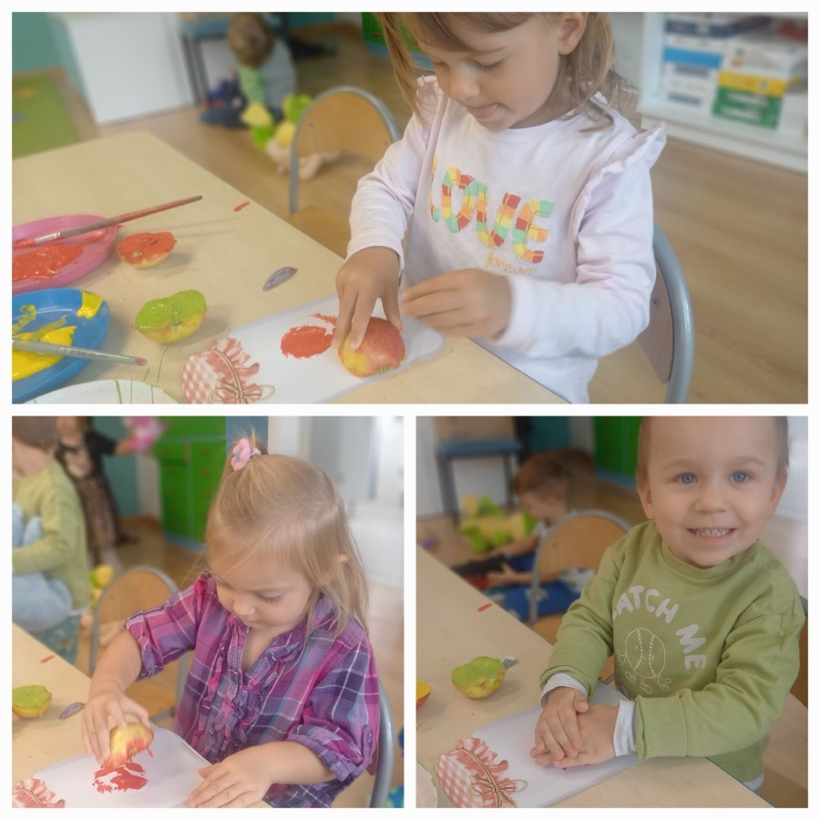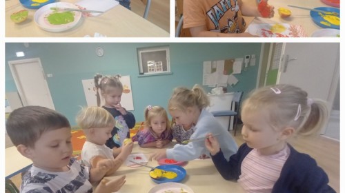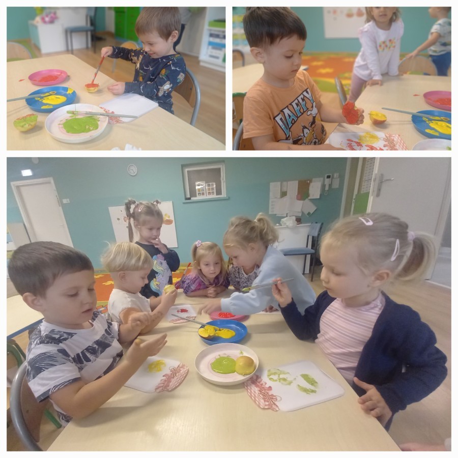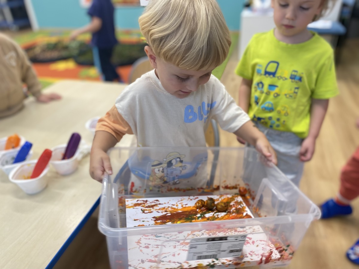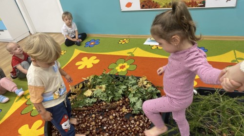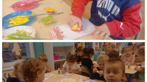 W grupie Krasnali nastała prawdziwa, złota jesień! Już od rana dzieci z radością przywitały wyjątkowego gościa – Panią Jesień, która przyniosła ze sobą kolorowe liście, kasztany i mnóstwo dobrej energii. Krasnale miały okazję przejść się po niezwykłym „dywanie Pani Jesieni” – sensorycznej ścieżce wypełnionej naturalnymi skarbami tej pory roku. To była prawdziwa uczta dla zmysłów! Nie zabrakło też chwili wytchnienia – dzieci z zaciekawieniem wysłuchały bajki o przybyciu Jesieni, a później rozruszały się podczas wesołych zabaw przy jesiennej muzyce. Na zakończenie tego wyjątkowego dnia mali artyści stworzyli piękne, kolorowe prace plastyczne malując... kasztanami!