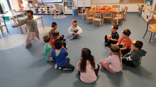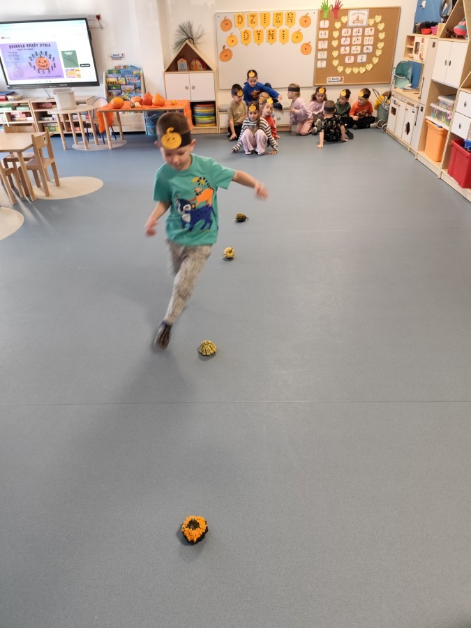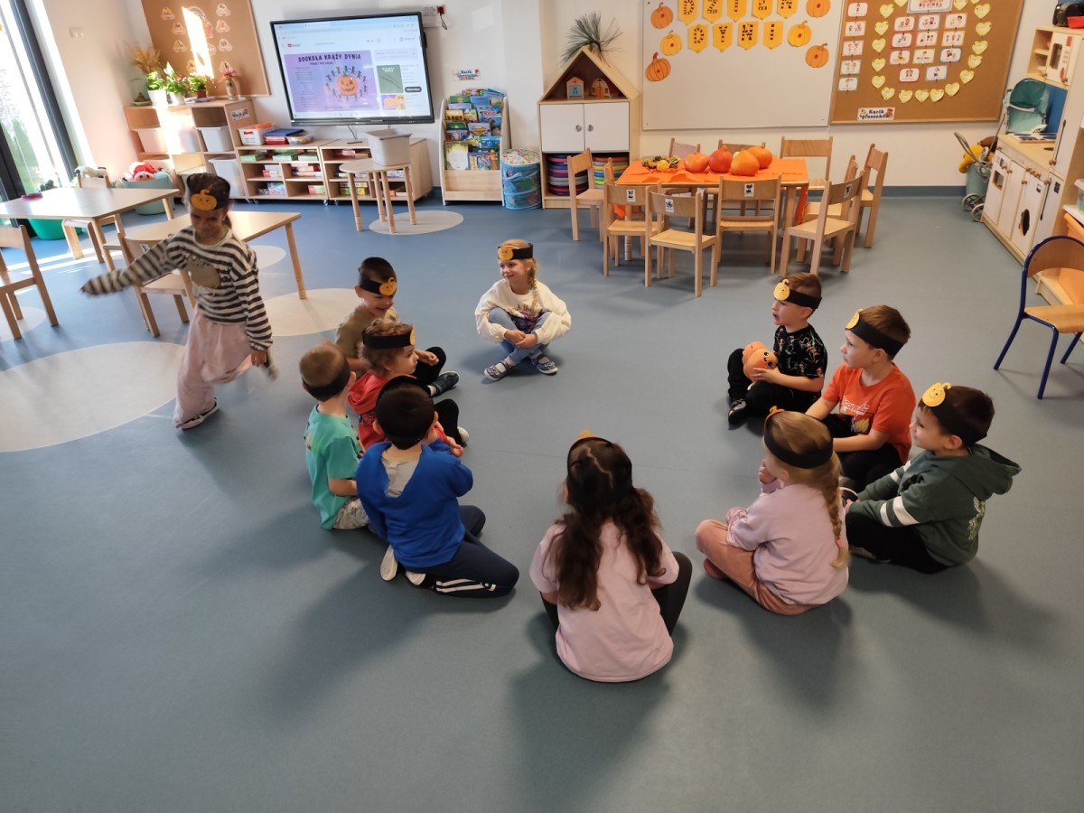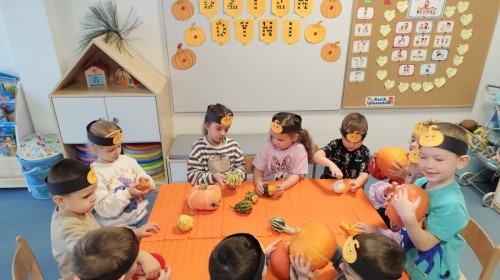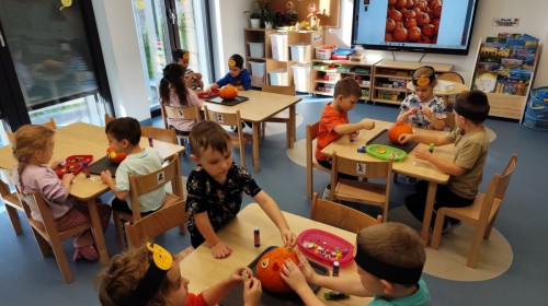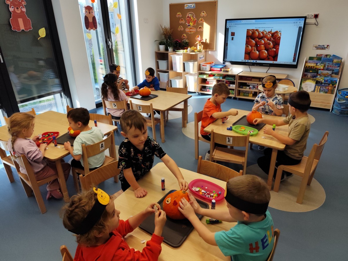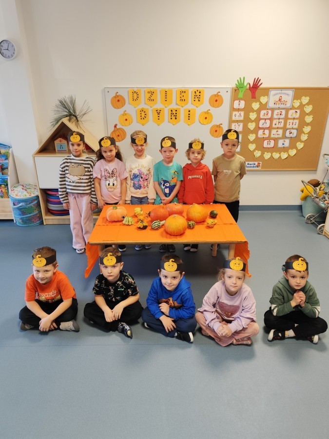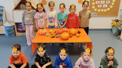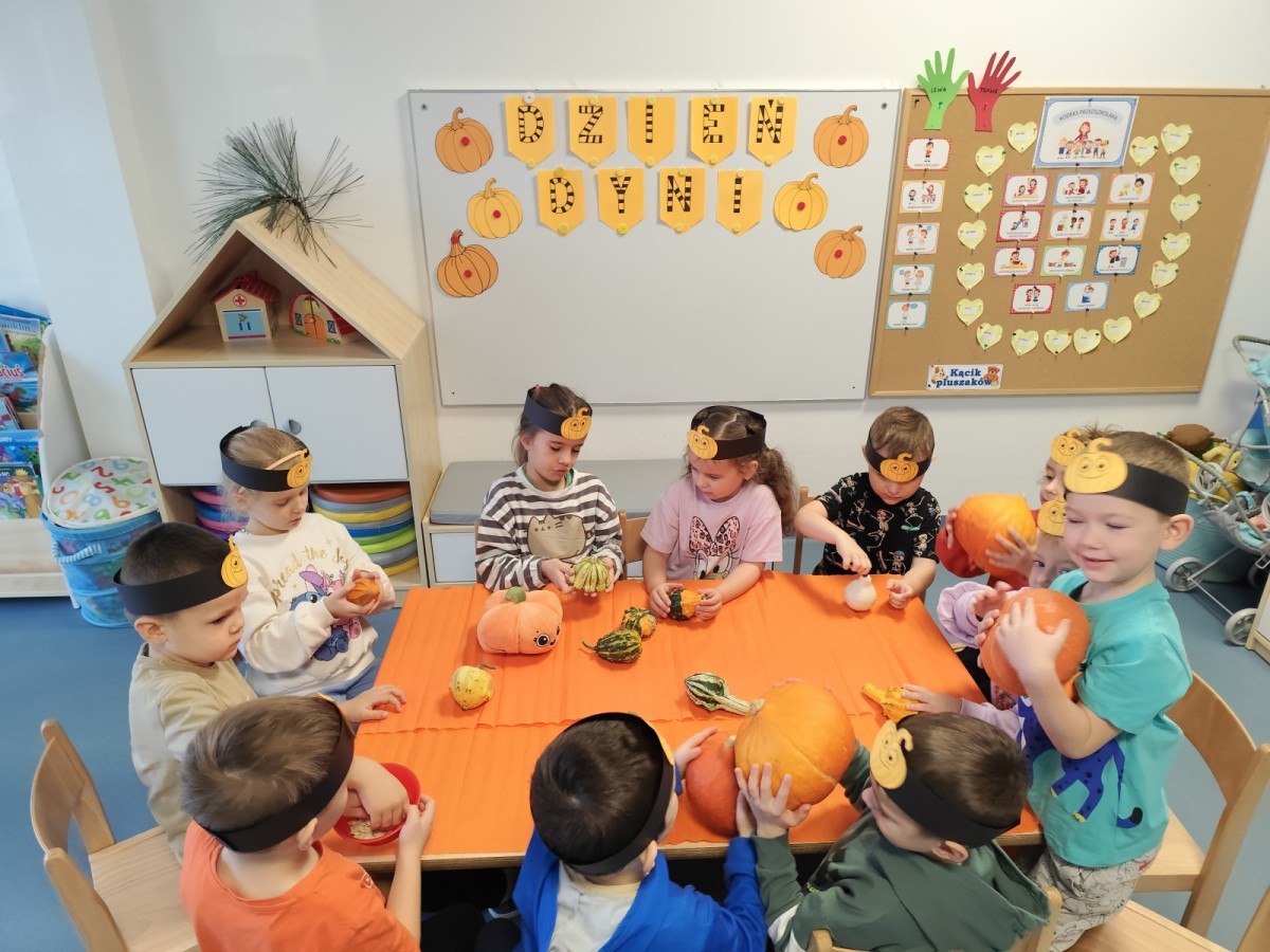 W dniu dzisiejszym czekało na dzieci z grupy Pszczółek mnóstwo atrakcji. Najpierw obejrzały film edukacyjny o dyni. Następnie z pomocą pani przygotowały dyniowe opaski, żeby później brać czynny udział w różnych zabawach muzyczno-ruchowych związanych z tematem dnia. Na koniec ozdabiały dynie przy stolikach w grupach.