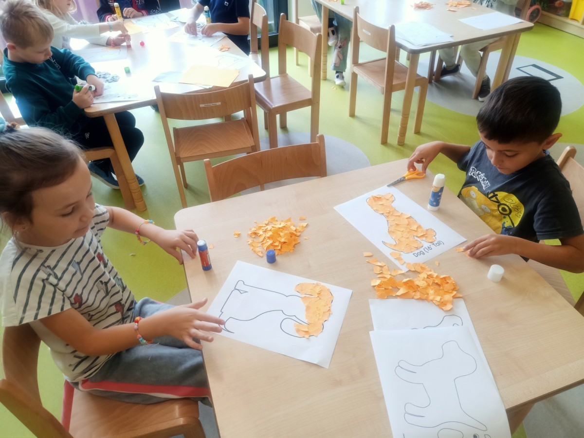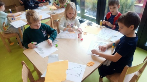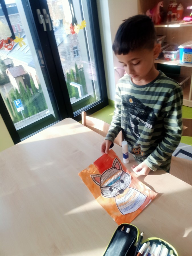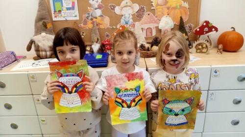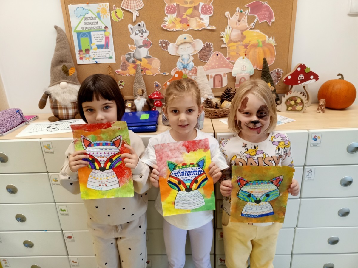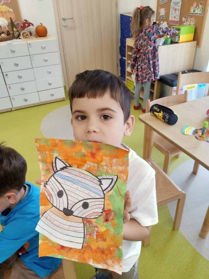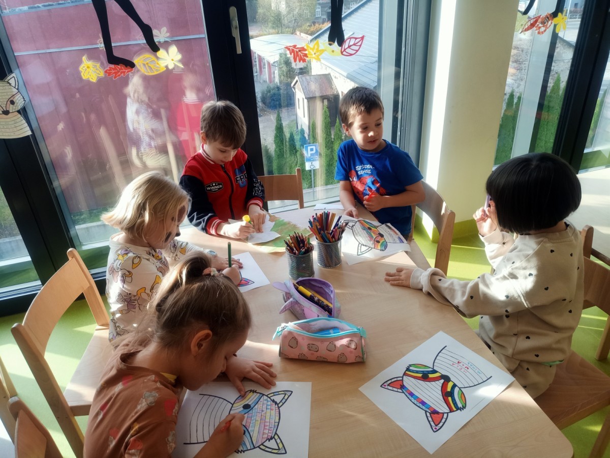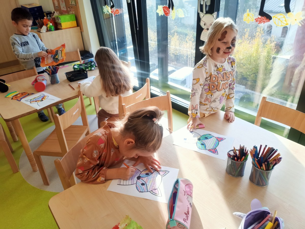 W piątek 14 listopada dzieci z zaangażowaniem tworzyły kolorowe liski, wykorzystując do tego kredki oraz flamastry. Podczas pracy dzieci rozwijały motorykę małą — wycinając i kolorując pobudzały swoją wyobraźnię, komponując własne, niepowtarzalne wersje liska. Wspólna aktywność sprzyjała również koncentracji i twórczej współpracy.