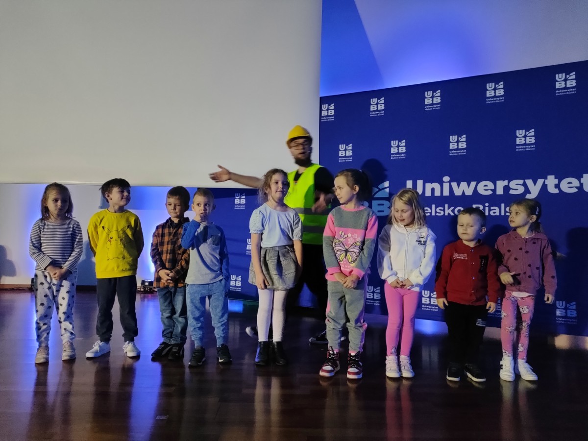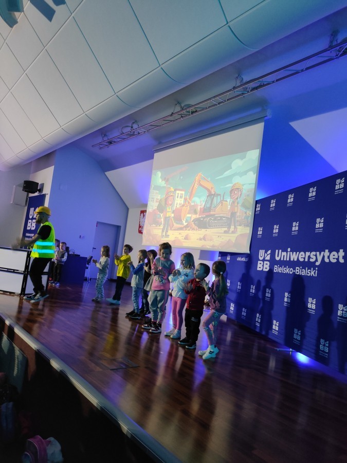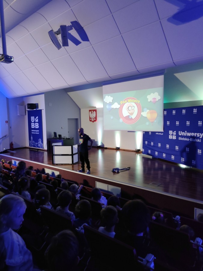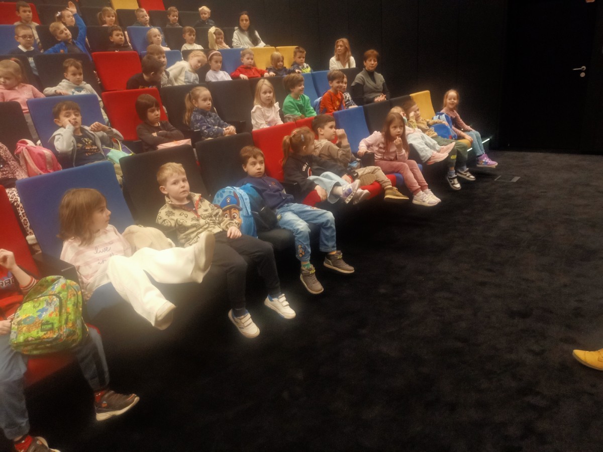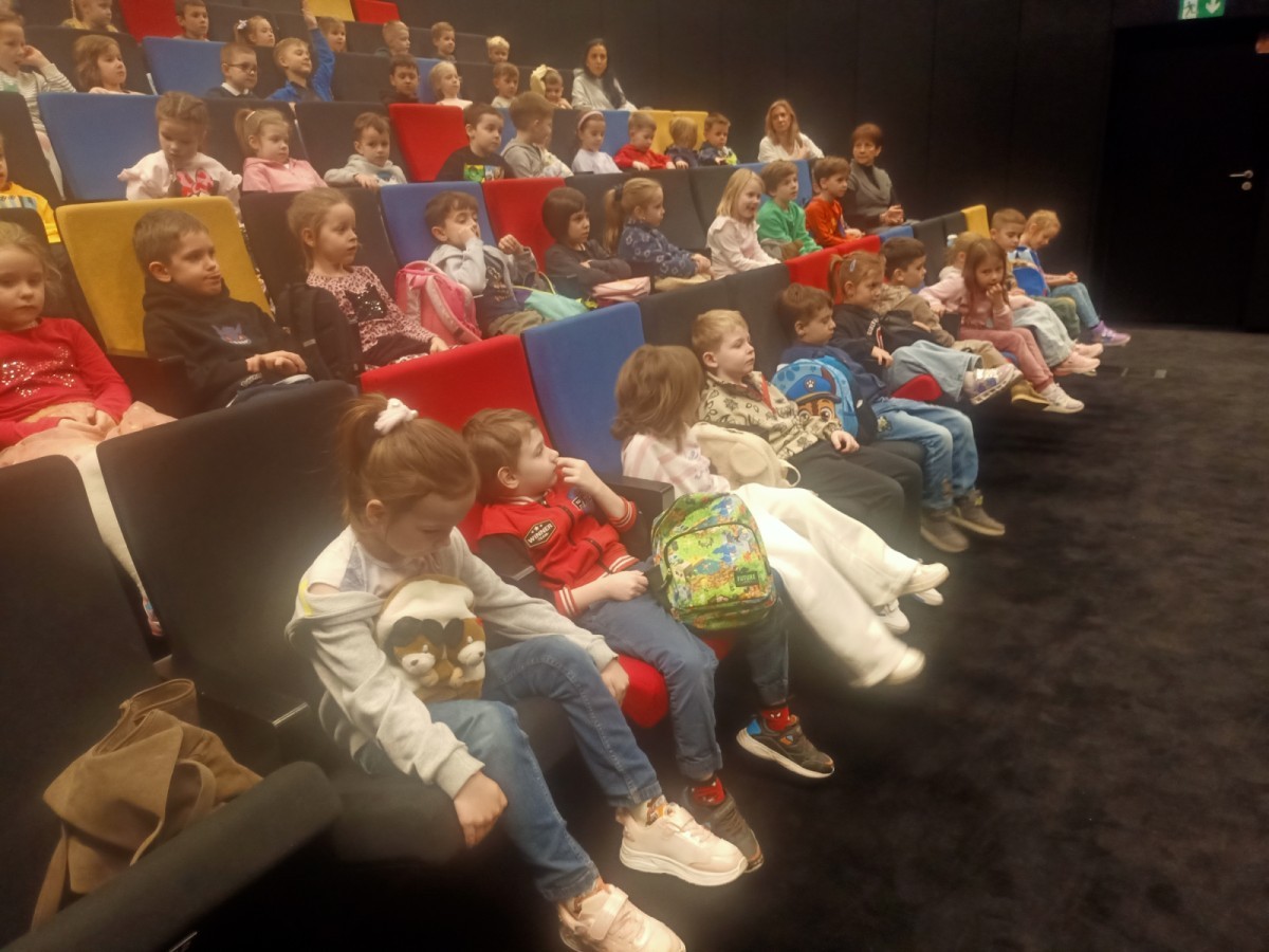 Dzieci z grupy „Motylki” wybrały się na wyjątkowy koncert Pana Miłosza, który odbył się w Auli Maximum Uniwersytetu Bielsko-Bialskiego. Już sama podróż była dla przedszkolaków niezwykłym wydarzeniem — dzieci pojechały autobusem, a dla niektórych był to pierwszy taki przejazd w życiu!