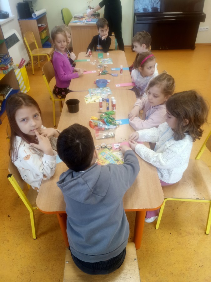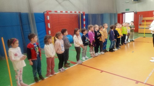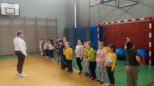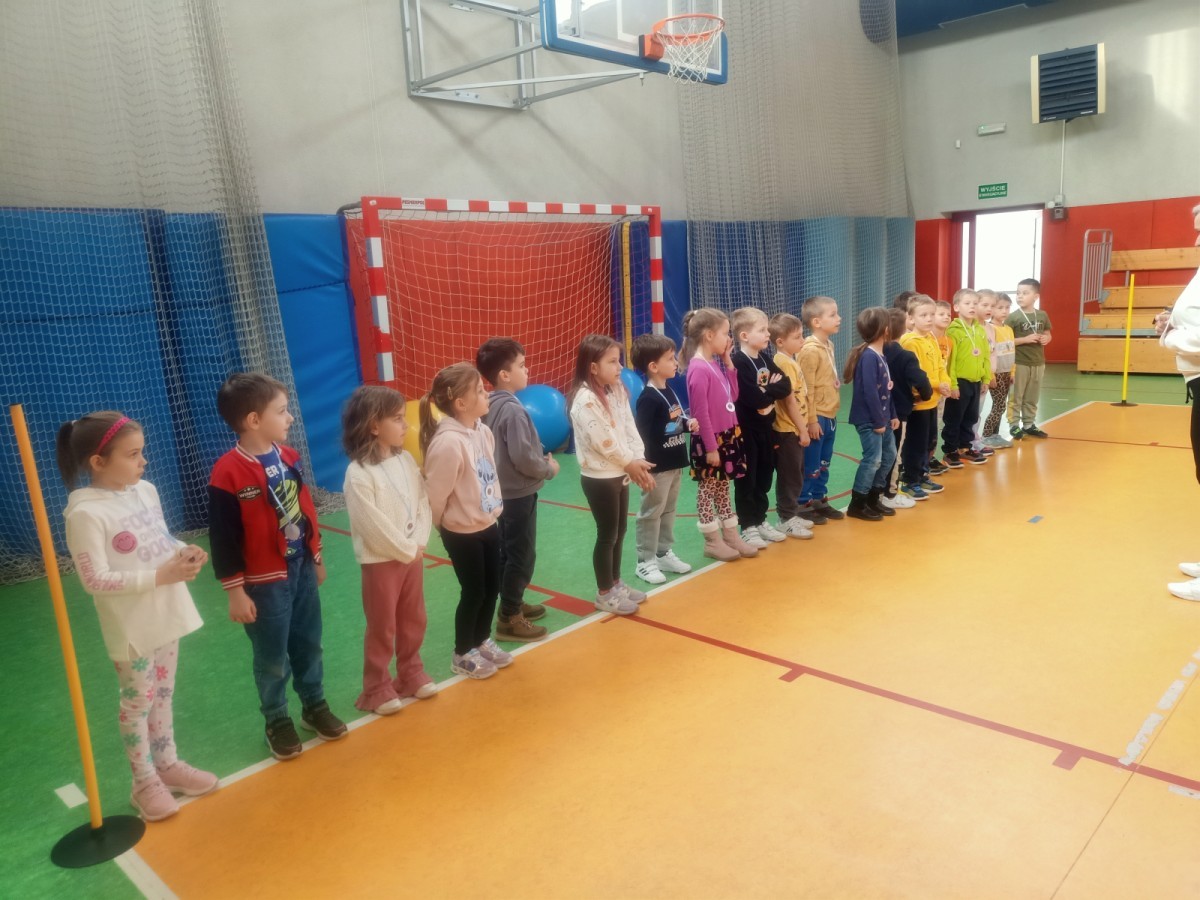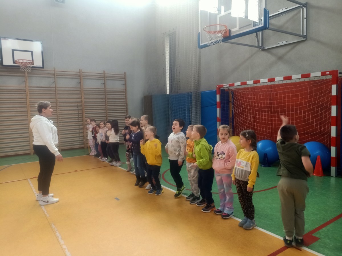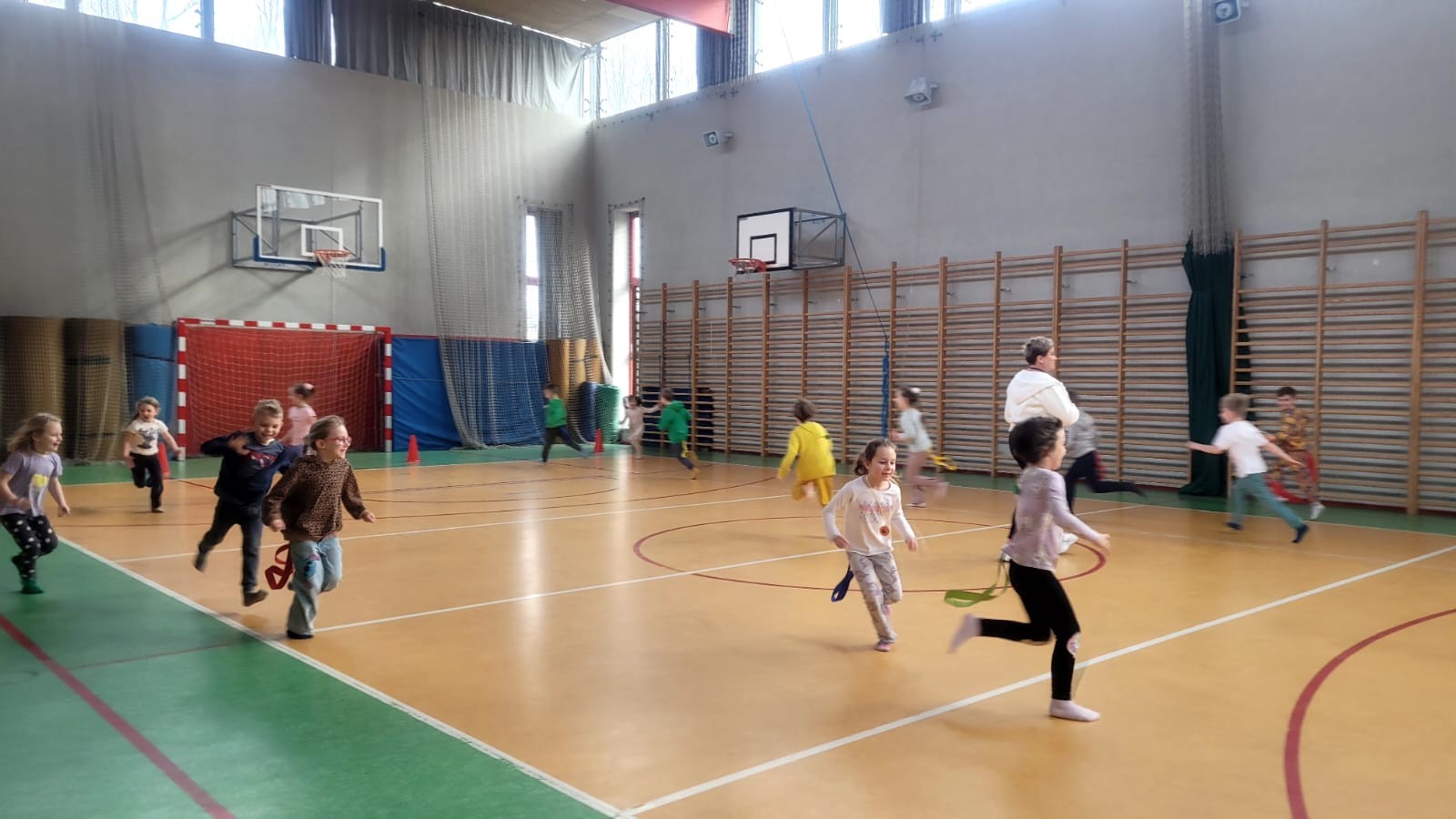 W jednej z klas dzieci wykonały piękne, kolorowe zakładki do książek, rozwijając swoją kreatywność i zdolności manualne. Następnie udały się na salę gimnastyczną, gdzie z dużym zaangażowaniem uczestniczyły w różnych ćwiczeniach ruchowych i zabawach sportowych.
