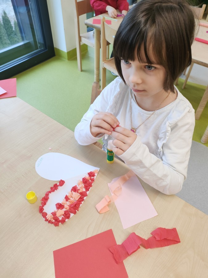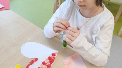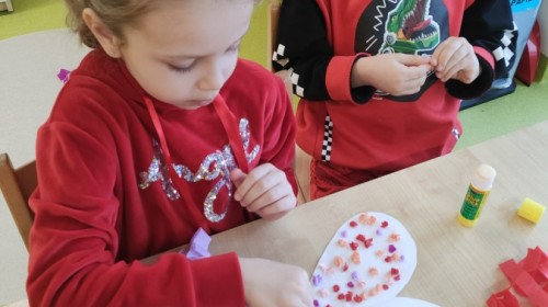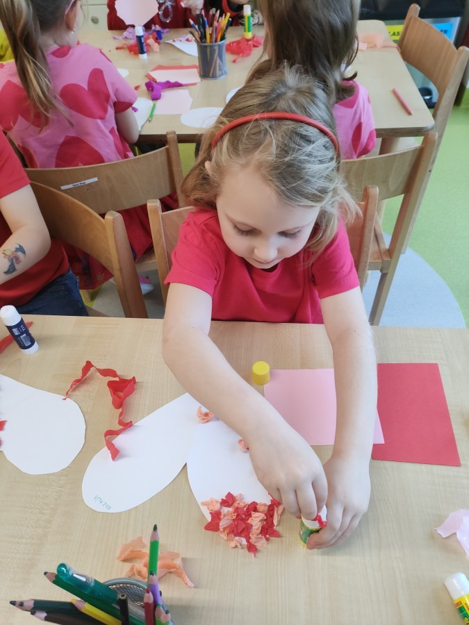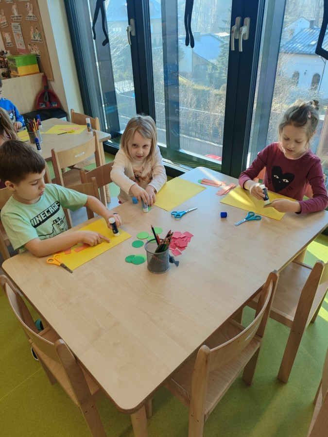 W dniu dzisiejszym dzieci pilnie pracowały, intensywnie rozwijając swoją motorykę małą. Z ogromnym zaangażowaniem formowały niezliczoną ilość małych kuleczek z bibuły, co wymagało precyzji i cierpliwości. Efektem ich wysiłku jest niezwykle efektowna, trójwymiarowa praca plastyczna, która zachwyca zarówno formą, jak i starannością wykonania.